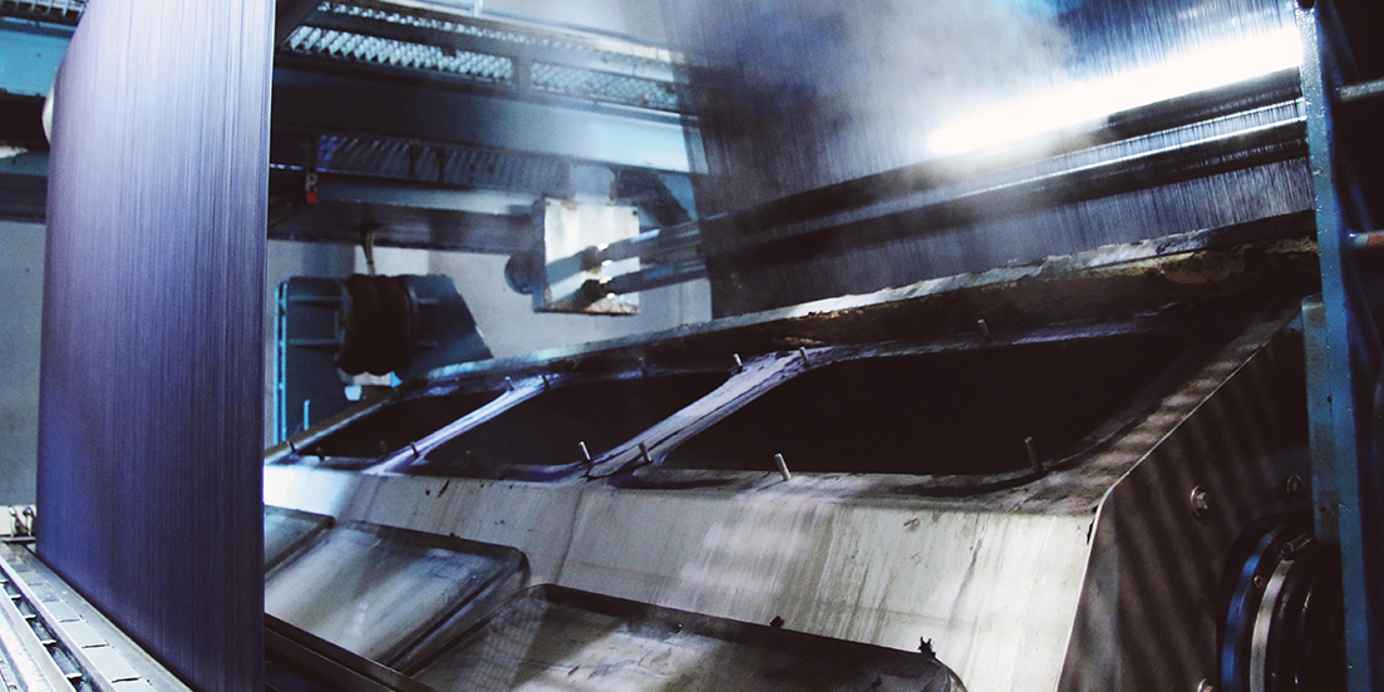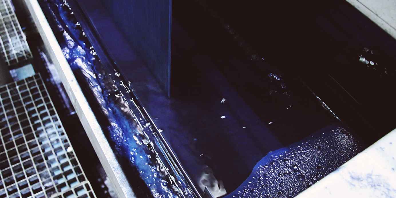 De vezels zijn verwerkt tot garens en gaan door een bad van indigo verf