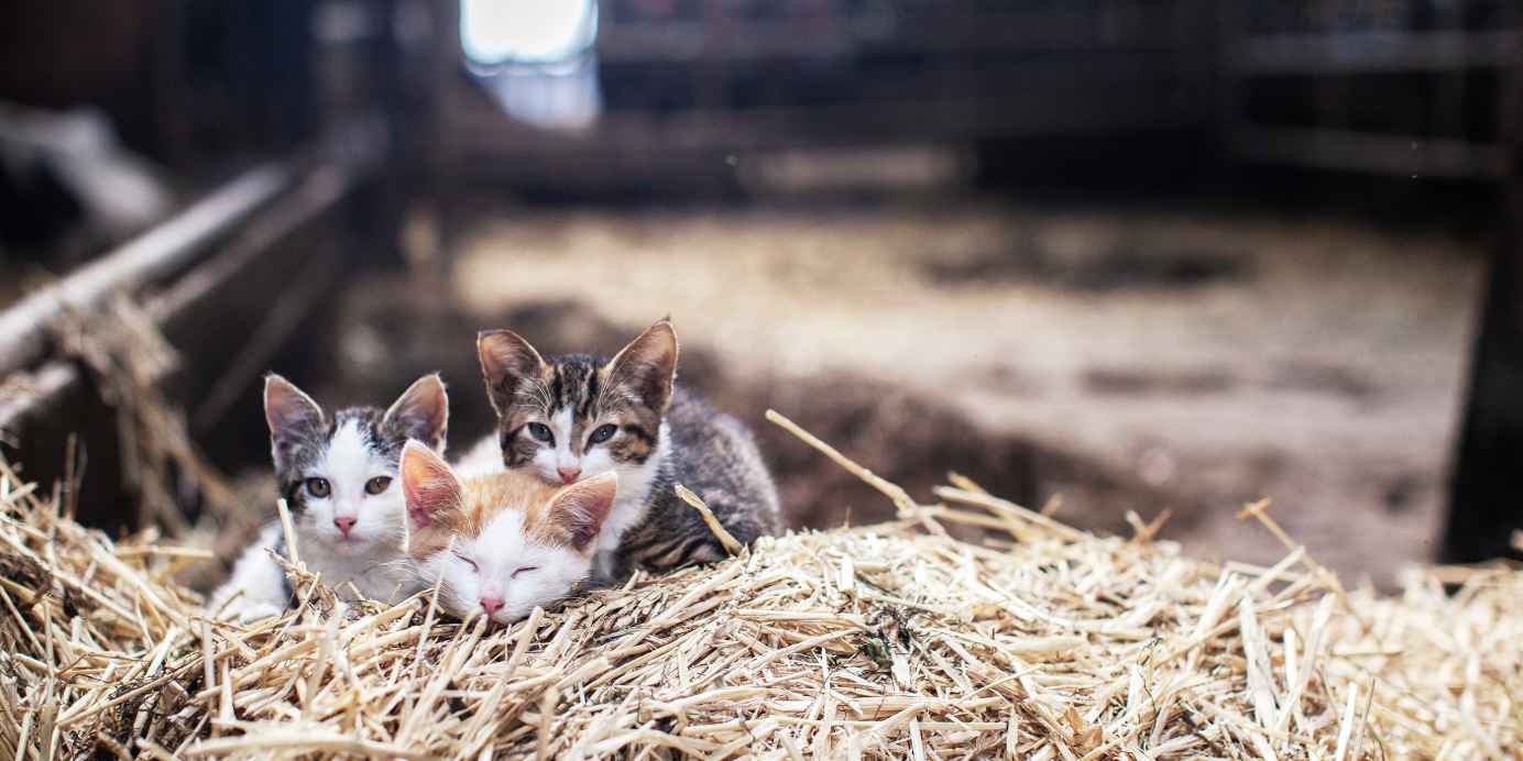 Poezen op het stro in de stal.