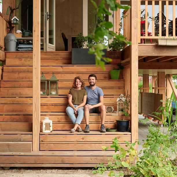 “We wilden graag buiten wonen. Met ruimte en stilte en een plek voor onze zweethutten. Verder niets. Op een dag bracht ik een vriendin van mijn dochter naar huis. We waren bevriend met haar ouders, dus ik liep er de keuken in en daar viel mijn oog op een moodboard dat aan de muur hing met zo’n honderd plaatjes van huizen, ruimtes, natuur en zweethutten. Ik had dit zelf ook zo kunnen uitzoeken. Deze mensen wilden hetzelfde als wij. Konden we het niet samen doen? We gingen met z’n vieren in gesprek om af te tasten wat we wel en niet wilden en merkten meteen dat we op één lijn zaten. We besloten om samen te zoeken.”