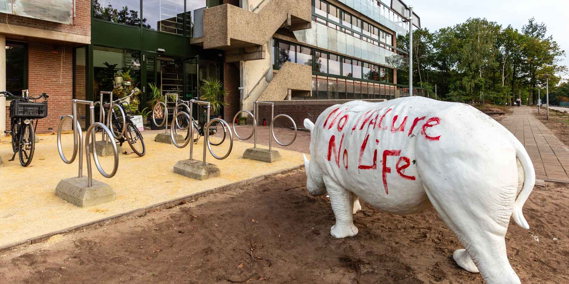 Sanne: “We gebruiken kunst en design als katalysator voor verandering.” Overal in het gebouw zie je werken en toepassingen die je verrassen, verwarren en inspireren. Objecten krijgen een nieuwe functie; oude wastafels zijn nu plantenbakken. Ook hangt het hele pand vol kunst, van een zwevende mensenhaai gemaakt van vishaken van Vincent Mock tot een wandkleed van Claudy Jongstra. En natuurlijk verhuisde ook ‘het huisdier’ mee: Messy, het Monster van COP Ness: een vijf meter lang wezen gemaakt van achthonderd afgedankte spijkerbroeken. Het werd in 2022 gemaakt door Mud Jeans en kunstenaar Billie Achilleos voor COP26.