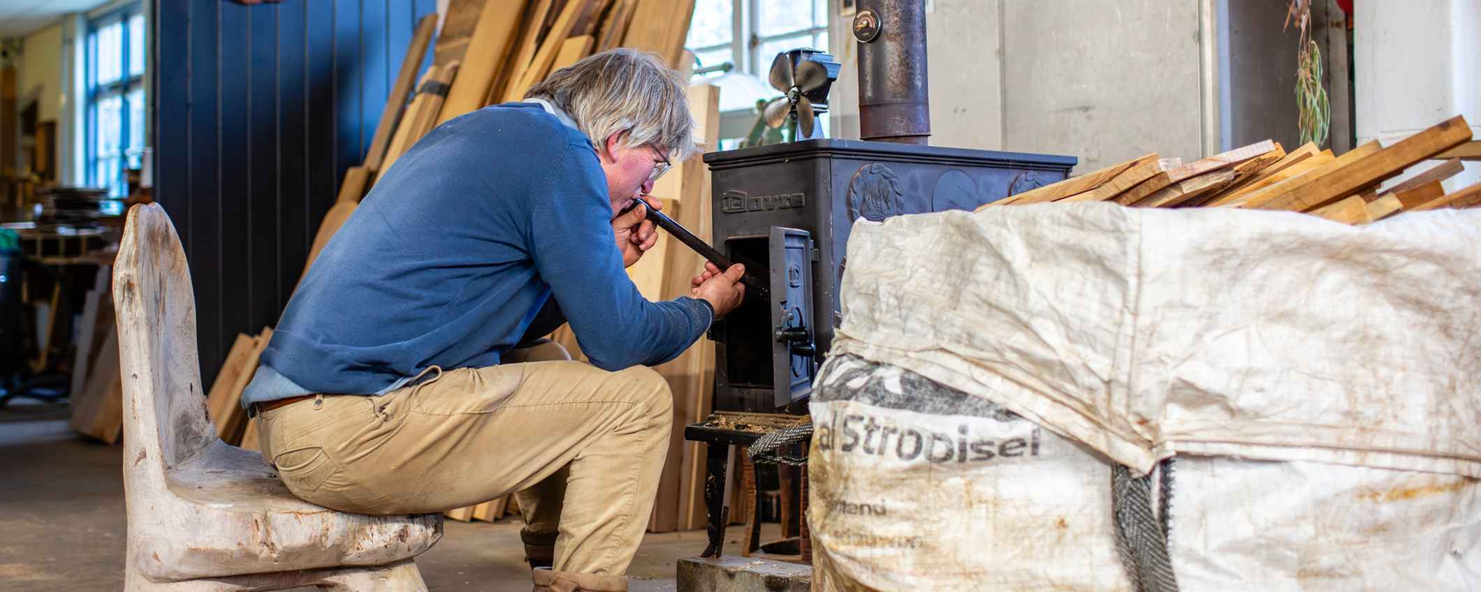 “Ik zaag, droog en verwerk alles zelf, hier in Gorssel. Ik zoek altijd naar manieren om dat zo zuinig mogelijk te doen. Ik probeer al het hout te gebruiken en tegelijkertijd de kwaliteit van het hout te verbeteren. Het is wel een proces dat geduld vraagt. Eerst moet het hout drogen in mijn droogschuur — ongeveer één centimeter per jaar. Soms moet ik dus wel tien jaar wachten, want ik kan het pas gebruiken voor een meubel als het echt droog is.”